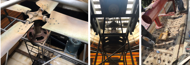 改造前为高转速动力系统,噪音大 出风口被挡住,散热效率差 冷却塔接水盘破裂